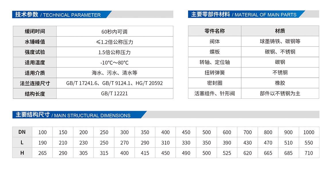 3、通過(guò)閥體兩側(cè)的活塞及控制活塞的油壓系統(tǒng)達(dá)到緩閉作用,噪聲小。