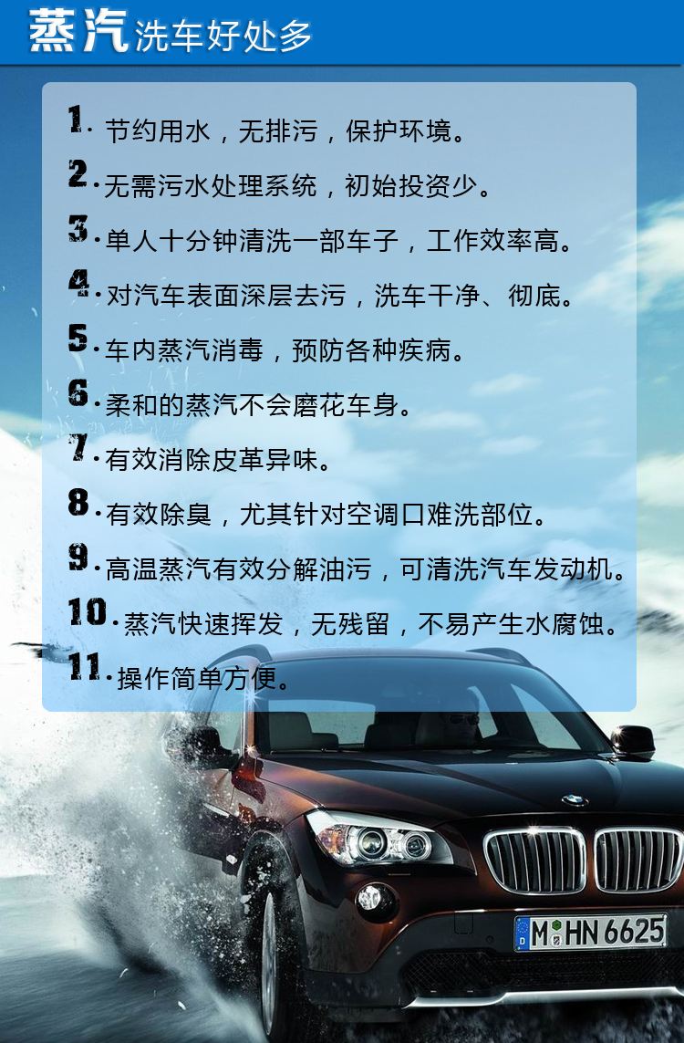 具備所有蒸汽洗車的共性,大量水資源的節(jié)約,清洗效果好,消毒殺菌,同時(shí)減少洗車時(shí)對環(huán)境的污染